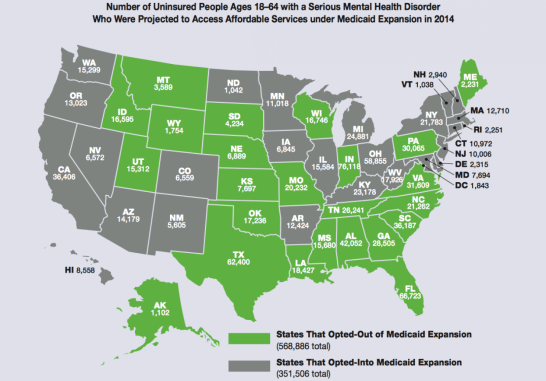 The grey states have accepted the expanded Medicaid funds, so the numbers there represent the estimated number of mentally ill patients that were treated. An estimated 350,000 people with mental illness received treatment for their conditions, including prescription drugs and regular health visits in 26 states and D.C., which did expand Medicaid in 2014.